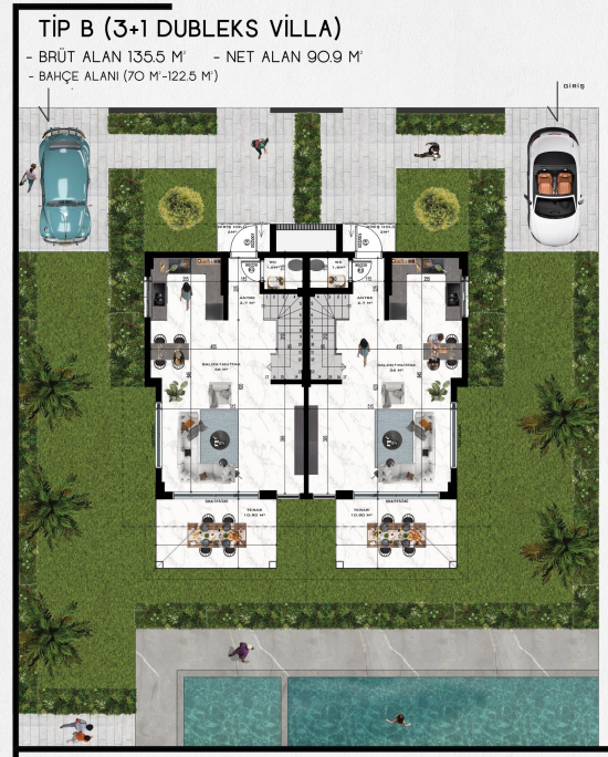 125 m2 havuz , 31,5 Çocuk Havuzu, Fitness Salonu, Kendine Ait Bahçe, 10 Adet Villa için Özel Otopark, Site İçi Güvenlik Kamerası, Yerden Isıtma Sistemi, Klima, Ani Su Isıtıcısı, 3’lü Ankastre Set, Buzdolabı